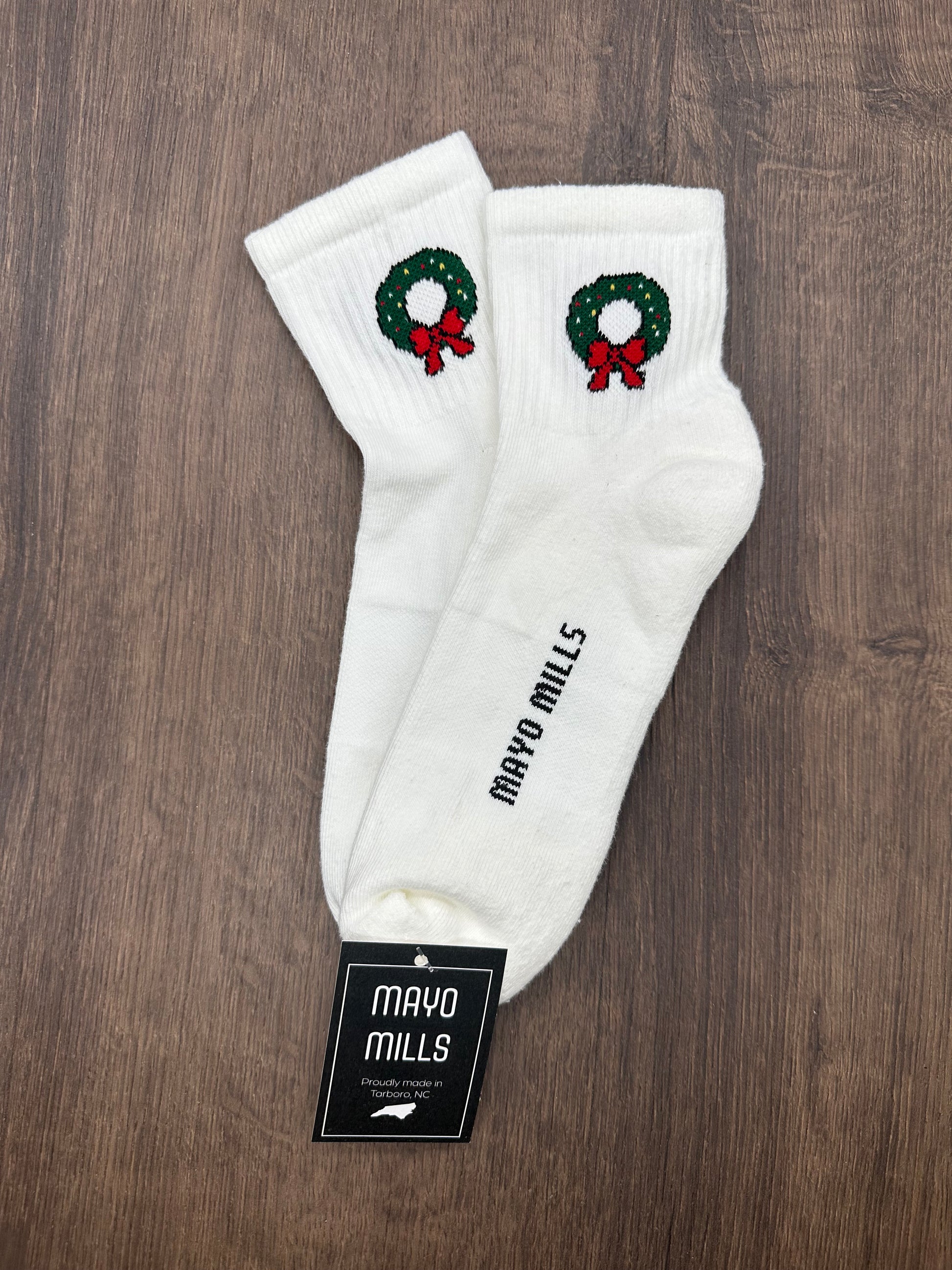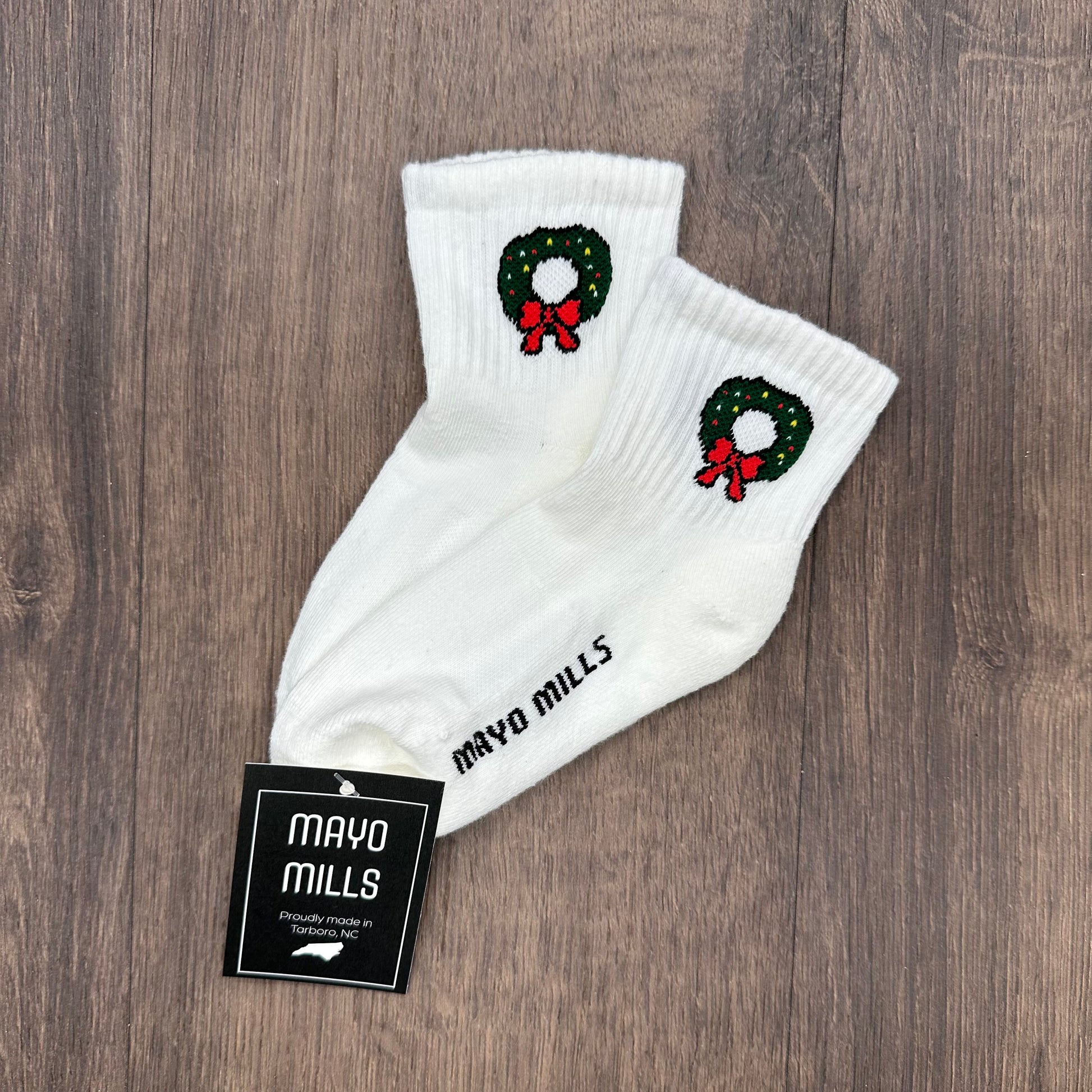 Celebrate the season with hometown cheer in these festive quarter crew socks, featuring a classic Christmas wreath and bow design. Proudly made in Tarboro, North Carolina, each pair combines holiday spirit with everyday comfort.