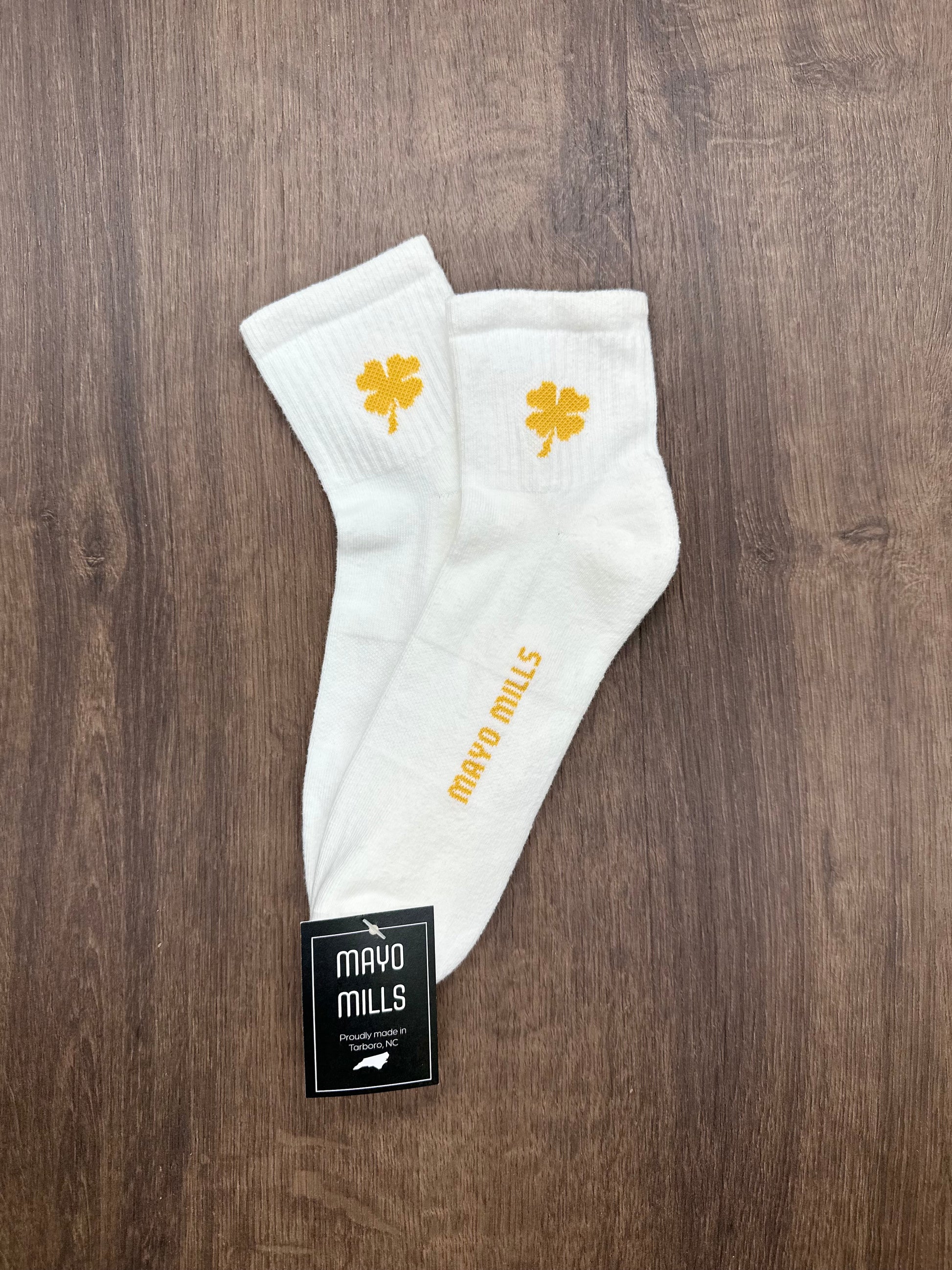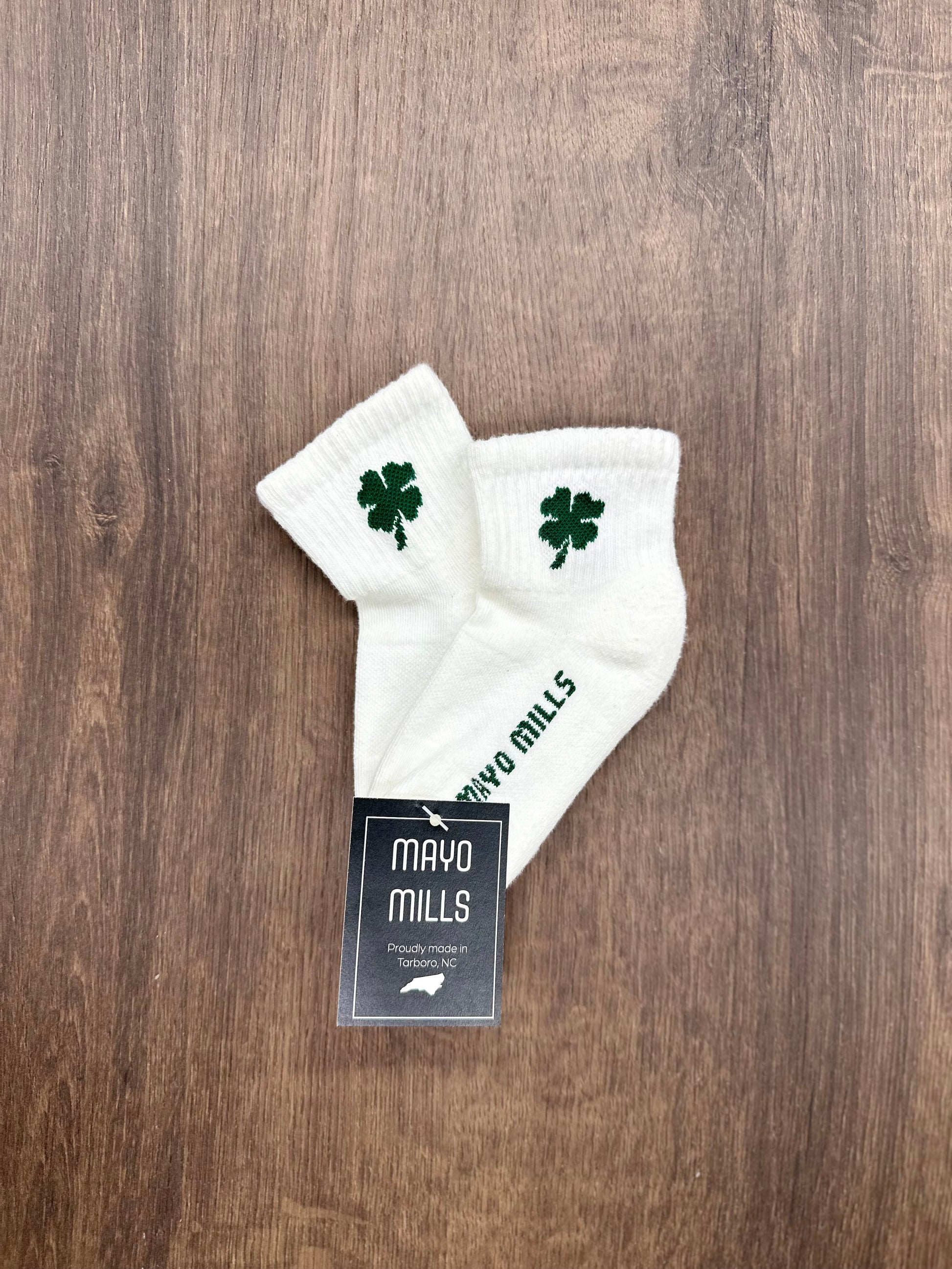 Add a little luck to every step with our limited-edition Clover Socks. Knitted from soft, North Carolina–grown cotton and finished right here in Tarboro, these quarter-crew socks feature a crisp white base accented with a single four-leaf clover on the ankle and a matching MAYO MILLS logo along the foot.