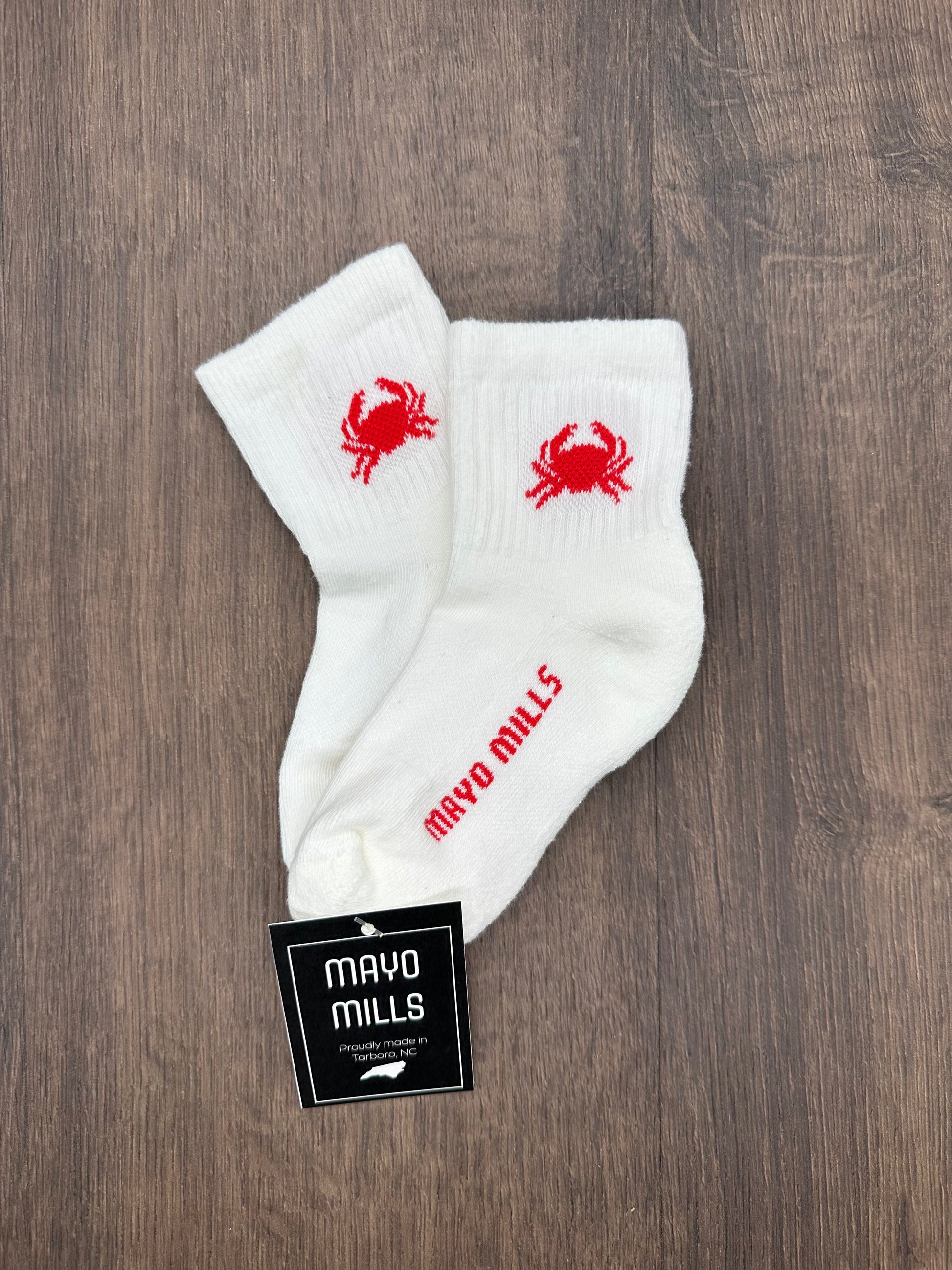 Bring a touch of coastal charm to your everyday style with our Crab Socks, proudly knit in Tarboro, North Carolina using cotton grown right here in the USA. These crisp white socks feature a bright red crab motif on the cuff and our signature MAYO MILLS logo along the foot for a bold pop of color.