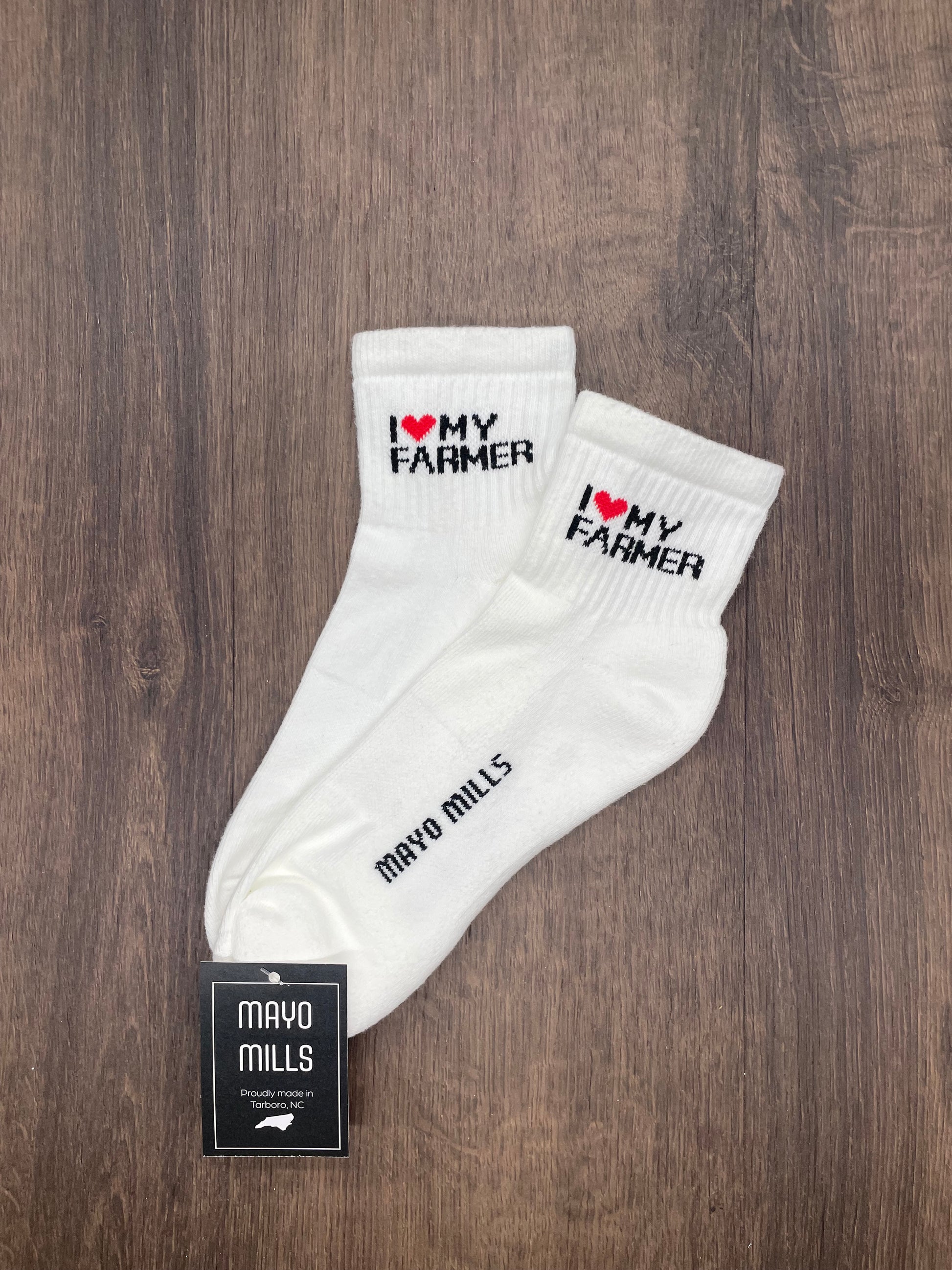 Celebrate the hardworking hands that feed us with our “I ❤️ My Farmer” Socks. Featuring bold black lettering and a red heart on the cuff, these socks are a perfect way to show love and appreciation for farmers everywhere. Whether you’re part of a farming family, married to one, or simply want to support American agriculture, these socks say it all.