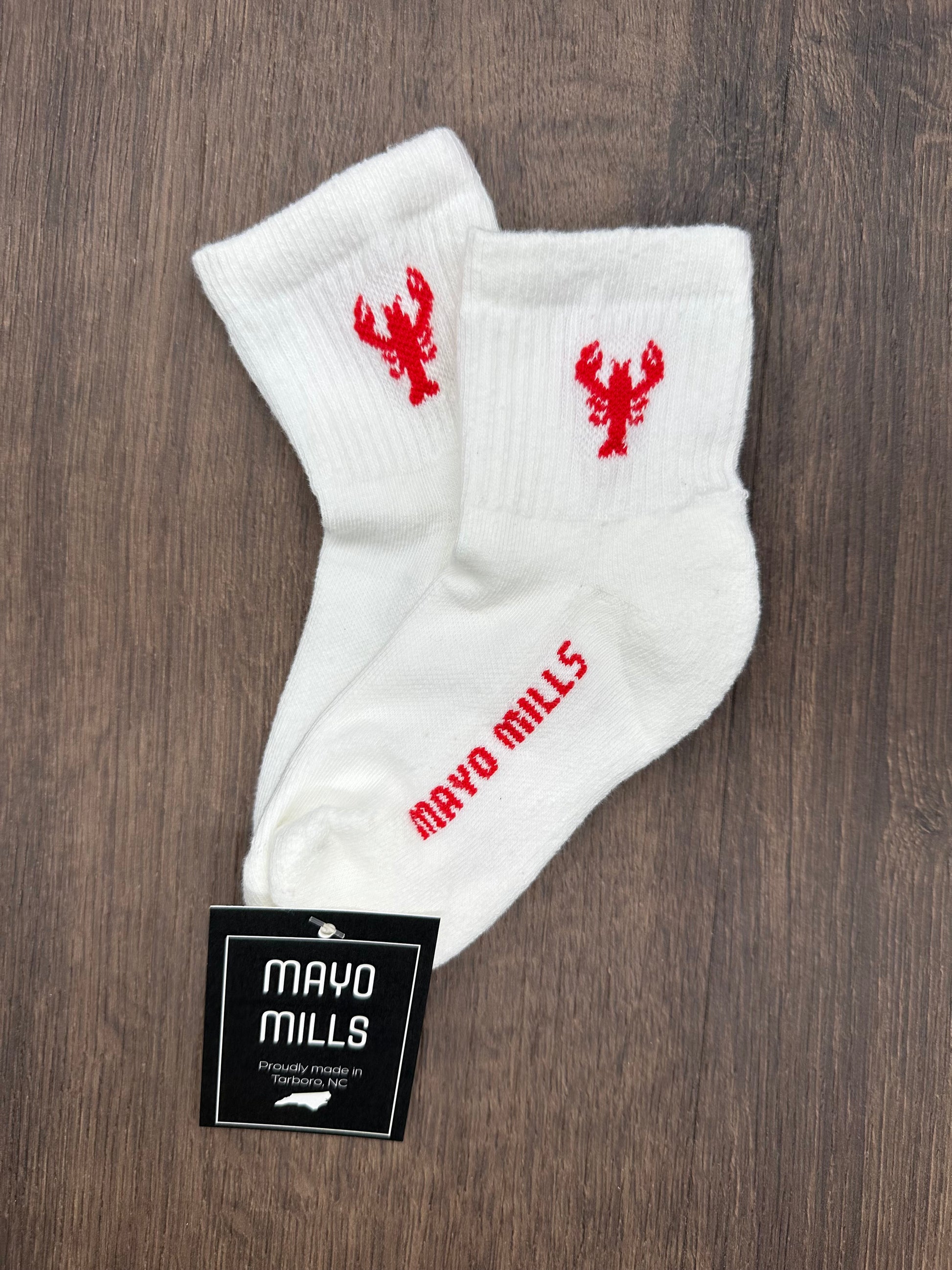 Make a splash with these playful Lobster Socks, proudly knit in Tarboro, North Carolina from soft, premium cotton grown right here in the USA. Crisp white with a bold red lobster motif on the cuff and matching MAYO MILLS logo on the foot, these socks bring coastal charm and classic style to any outfit.