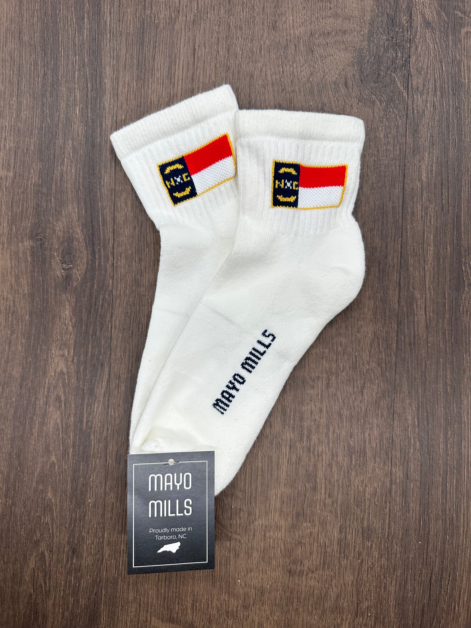Proudly represent the Old North State with our NC Flag Quarter Crew Socks. Featuring the bold North Carolina state flag on the cuff, these socks are a stylish way to show your Tar Heel pride every day. Available in white, black, and natural cotton, they’re perfect for both casual wear and gifting.