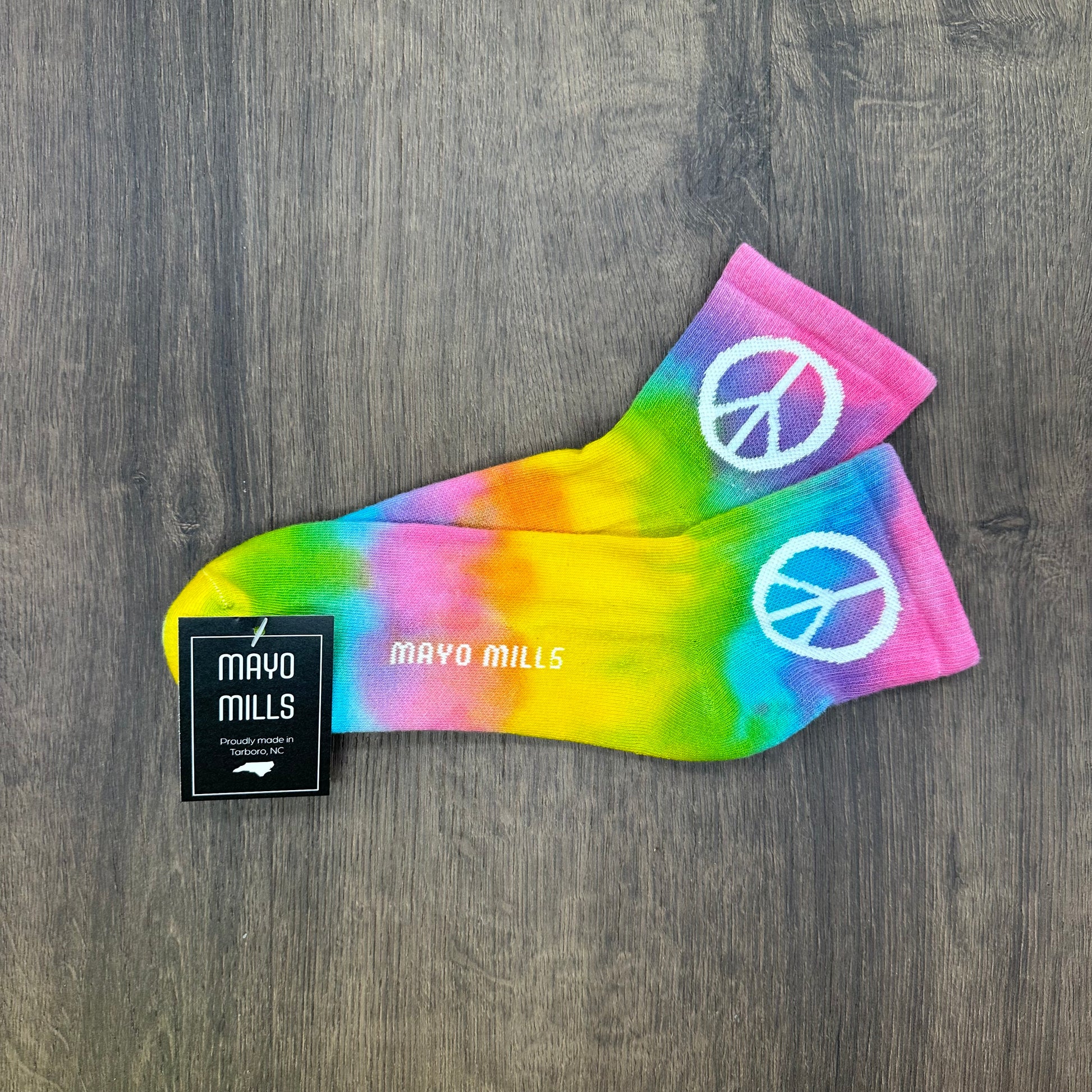Step into comfort and style with our Peace Sign Quarter Crew Socks, straight from the heart of Tarboro, NC. Crafted from the finest cotton sourced from our family's farm, these socks are a vibrant expression of individuality. Each pair features a peaceful embroidered peace sign, bringing a touch of positivity to every step.