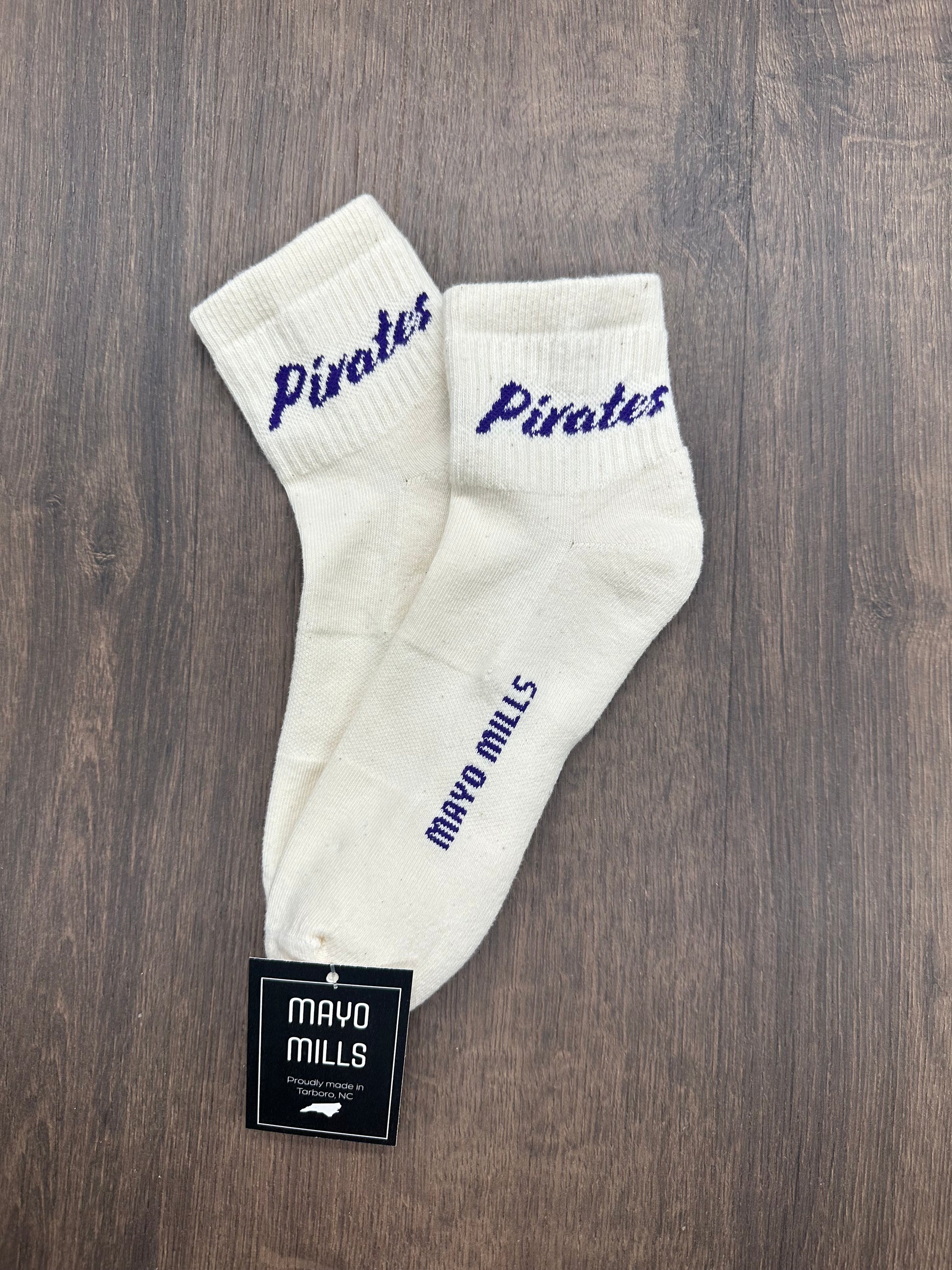 Design: Classic white base with purple Pirates lettering on the cuff and Mayo Mills branding along the footbed.